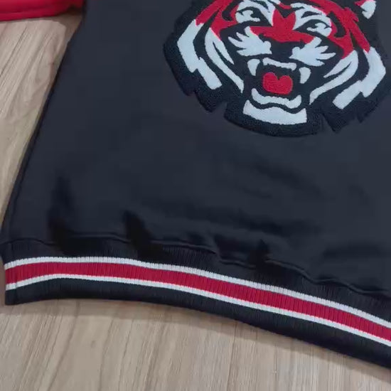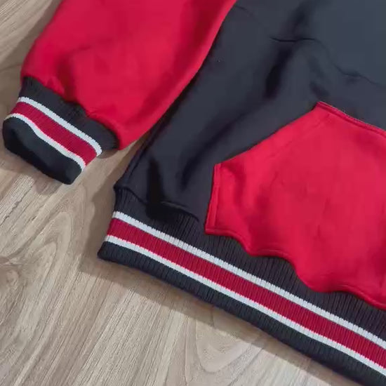 This item is a half zip pullover fleece sweatshirt. Sleeves and pockets are a contrasting red color with a black body. Logo on the front is embroidered. Back logo is chenille. Elastic waist and wrist bands with contrasting colors.